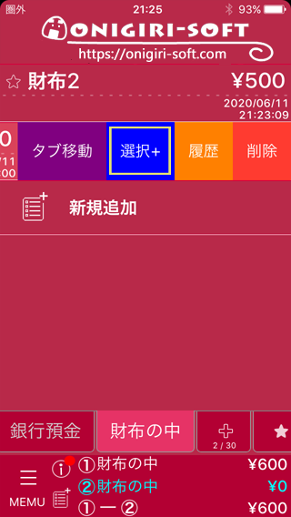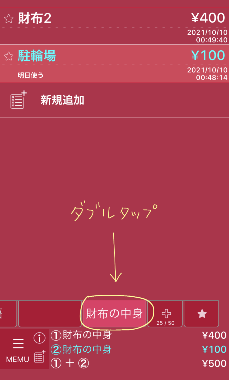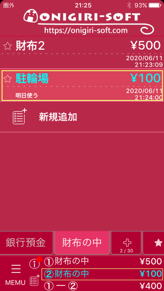財布の中身(財布2)500円の中から明日使う予定の駐輪場代100円を別項目に分けて表示したい時。