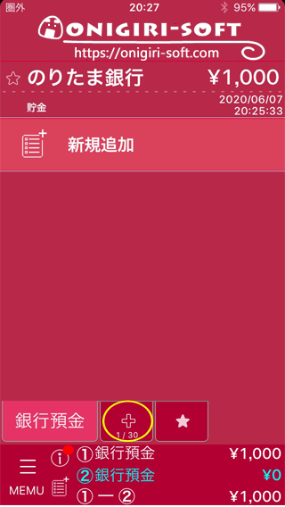 銀行預金のタブのとなりにある+(プラス)のタブボタンをタップするとタブを追加できます。