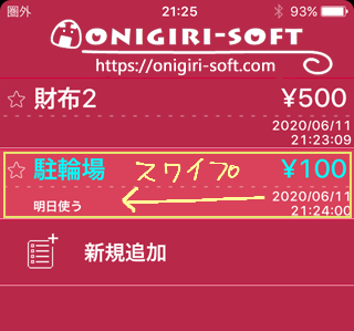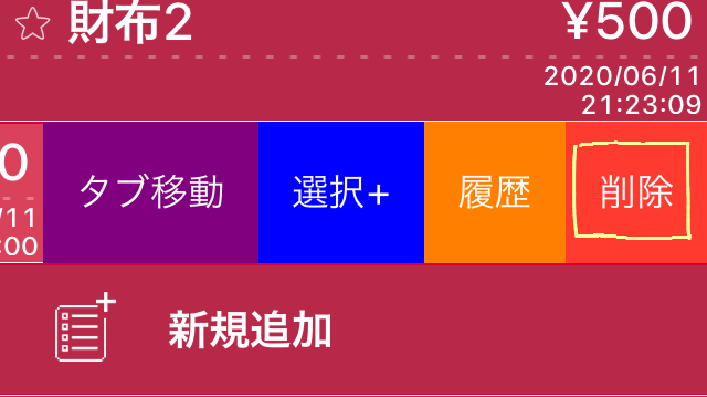 翌日になり、駐輪場代の支払いも終わった後は駐輪場代の行を左スワイプメニューから「削除』し、同時に財布2の500円からも100円減ったので編集から-100円します。